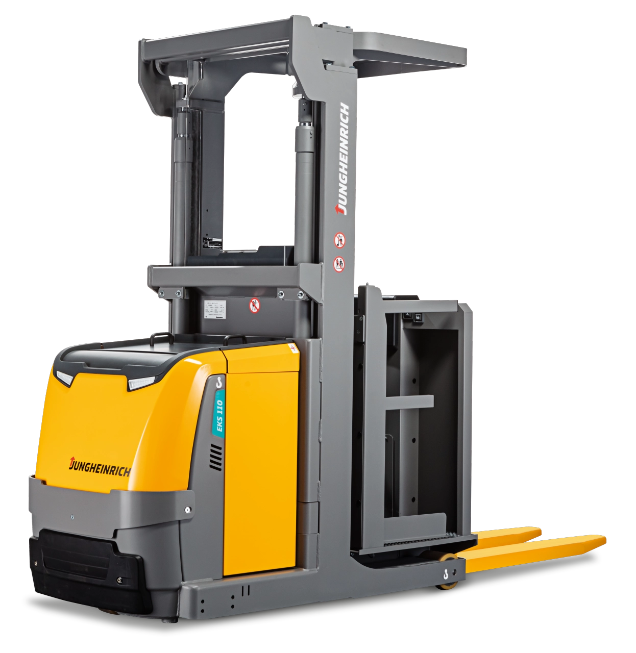 Notre préparateur de commandes vertical robuste et ergonomique EKS 110 est le partenaire idéal pour la préparation de commandes jusqu’au troisième niveau de stockage dans des allées larges. Des hauteurs de préparation de commandes jusqu’à 4,6 mètres sont atteintes grâce à la hauteur de plate-forme maximale de 3 mètres. La conception en porte-à-faux permet la prise de palettes ouvertes et fermées. La motorisation 3,2 kW économe en énergie impressionne par des performances d'accélération élevées, des autonomies de batterie élevées permettent de longues utilisations même en exploitation sur plusieurs postes. L’accès bas, l’adhérence accrue de la plate-forme et la liberté optimale de mouvements lors de la montée et de la descente assurent un travail sûr. Le poste de conduite est conçu pour un travail avec ménagement : une disposition intuitive des éléments de commande, un écran de 4 pouces et trois programmes de conduite sélectionnables. Par ailleurs, divers systèmes d’assistance et options d'équipement rendent l’utilisation de ce préparateur de commandes à haute levée polyvalent. Pour le cariste, c’est simple : il suffit de monter et de le mettre en route.